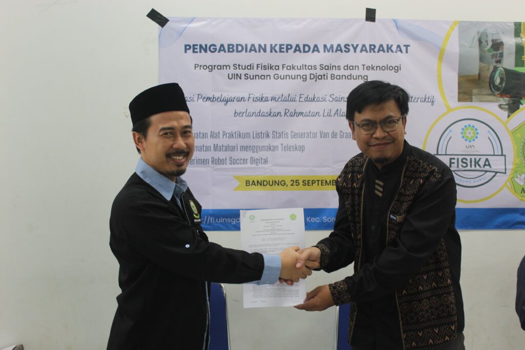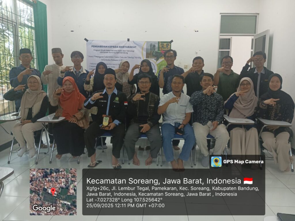Bandung, 25 September 2025 – Program Studi Fisika UIN Sunan Gunung Djati Bandung kembali melaksanakan kegiatan Pengabdian Kepada Masyarakat (PKM) dengan tema “Inovasi Pembelajaran Fisika Melalui Edukasi Sains dan Teknologi Interaktif Berlandaskan Rahmatan lil ‘Alamin”. Kegiatan ini diselenggarakan pada Kamis, 25 September 2025 di Madrasah Aliyah (MA) Al Jawahir, Soreang, Kabupaten Bandung.
