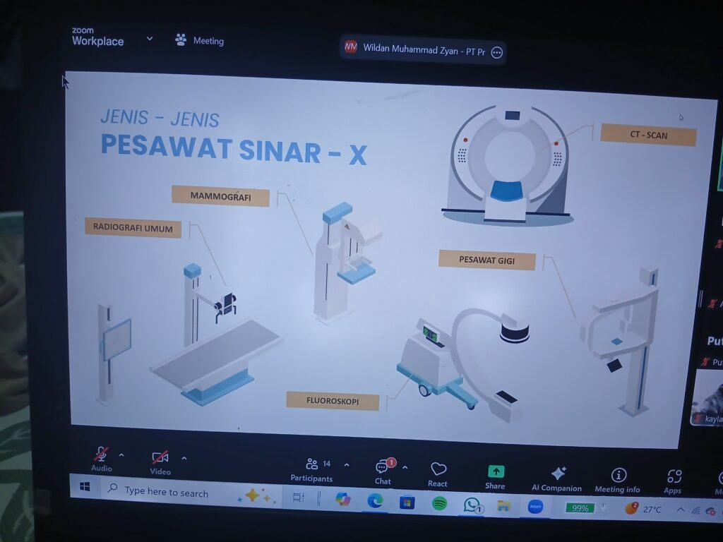 Materi yang disampaikan membahas prinsip dasar pembentukan sinar-X, interaksi radiasi dengan materi, serta penerapan fisika radiasi dalam sistem pesawat sinar-X di fasilitas kesehatan. Kuliah ini juga menyoroti aspek keselamatan radiasi serta pentingnya peran fisikawan medis dalam menjamin kualitas dan keamanan penggunaan alat.