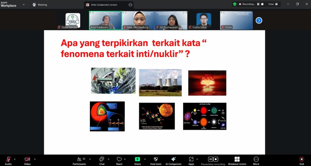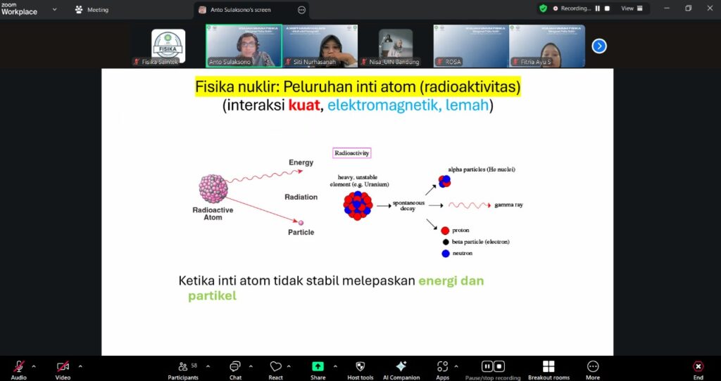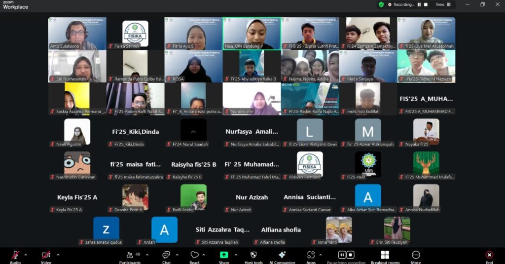 Bandung — Jurusan Fisika Fakultas Sains dan Teknologi (FST) UIN Sunan Gunung Djati Bandung kembali menyelenggarakan kegiatan Kuliah Umum Fisika dengan tema “Mengenal Fisika Nuklir: Dari Dasar Teori Hingga Topik Riset yang Bisa Dikembangkan” pada Selasa, 14 Oktober 2025 secara daring melalui platform Zoom Meeting.