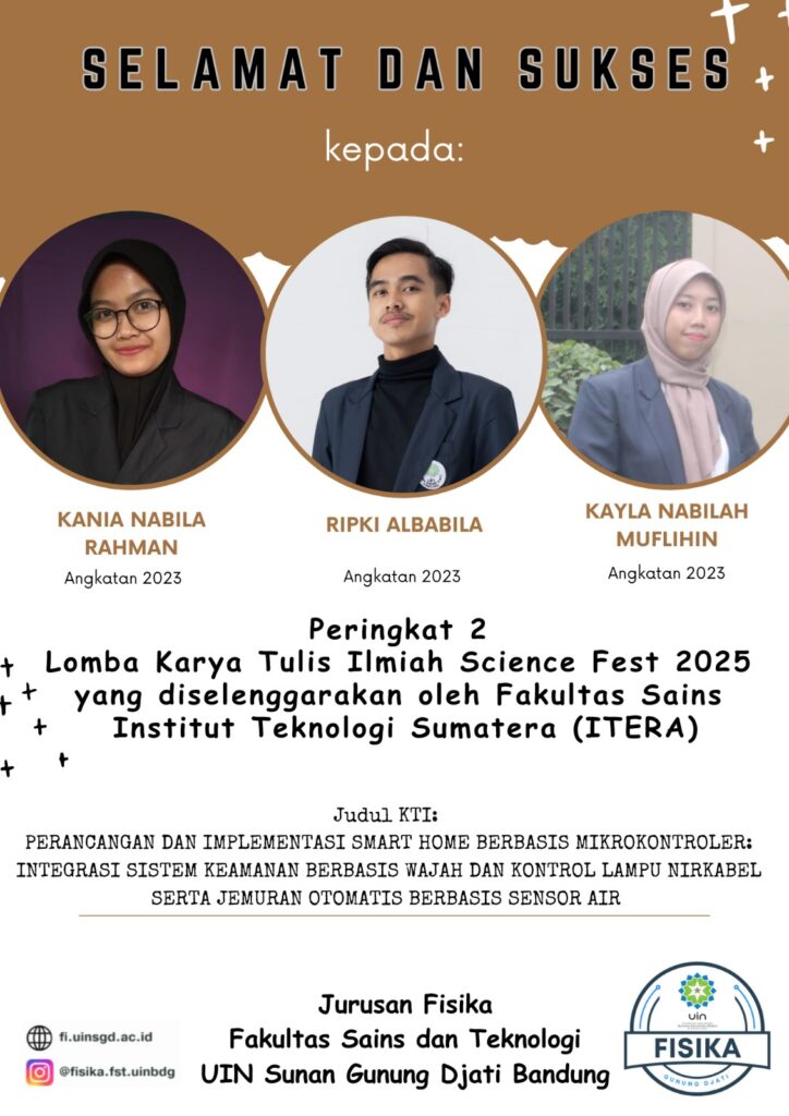 Bandung, Oktober 2025 — Prestasi membanggakan kembali diraih oleh mahasiswa Jurusan Fisika Fakultas Sains dan Teknologi UIN Sunan Gunung Djati Bandung.