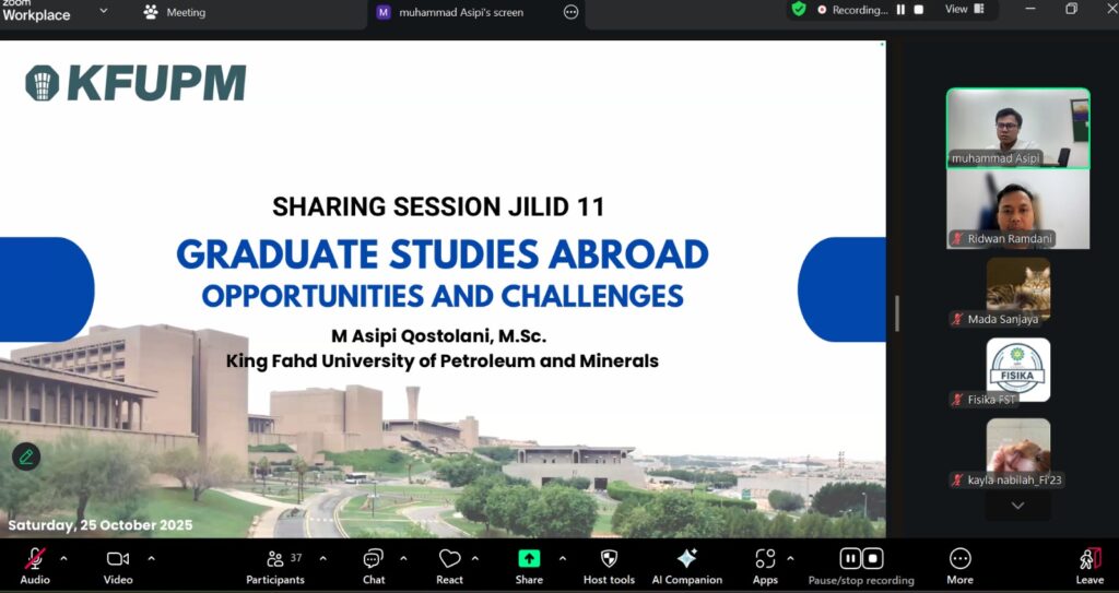 Kegiatan yang dilaksanakan secara online melalui Zoom Meeting ini menghadirkan narasumber M. Asipi Qostolani, M.Sc, alumni Jurusan Fisika yang berhasil meraih beasiswa di King Fahd University of Petroleum and Minerals (KFUPM), Arab Saudi.