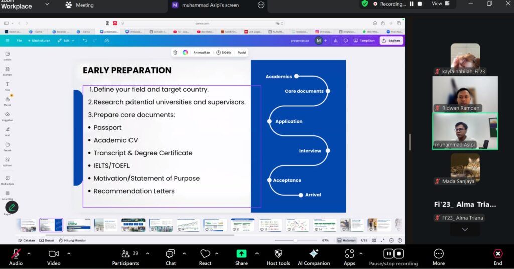Dalam pemaparannya, M. Asipi Qostolani, M.Sc. menceritakan perjalanan akademiknya hingga memperoleh beasiswa penuh di KFUPM, mulai dari proses seleksi, adaptasi lingkungan internasional, hingga peluang riset yang terbuka luas di bidang Fisika dan energi. Ia juga menekankan pentingnya persiapan akademik, kemampuan bahasa Inggris, dan mental pantang menyerah.